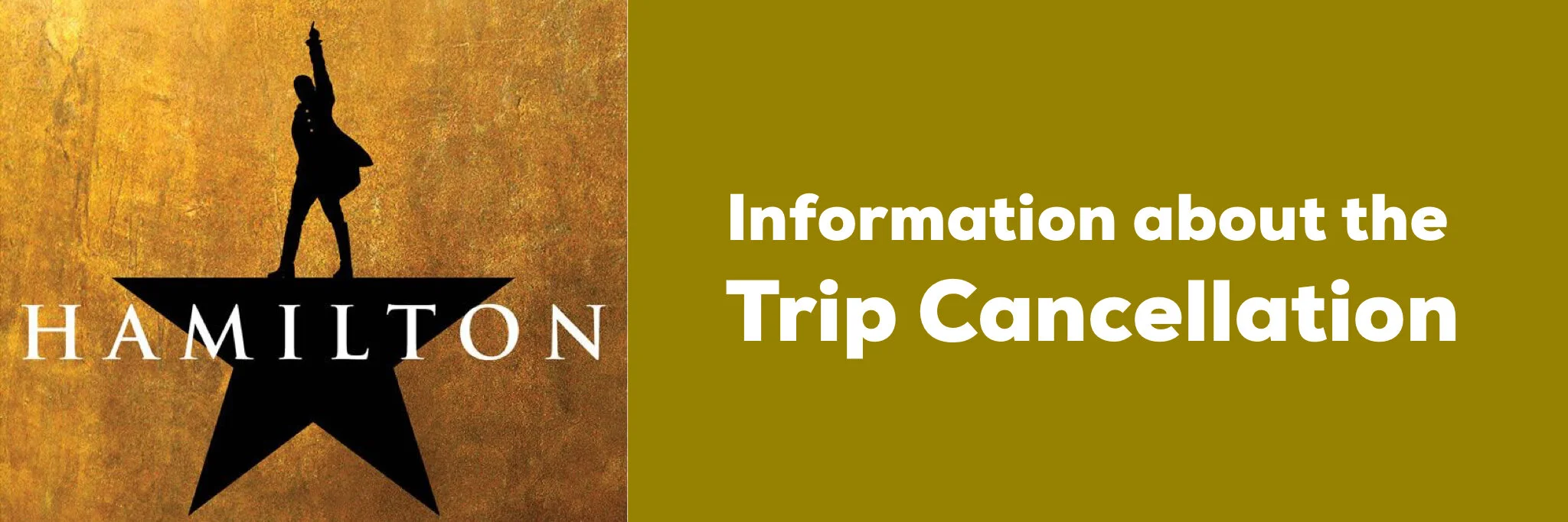 Due to the COVID19 Crisis and the surrounding cancellations regarding public gatherings, the trip to Hamilton, The Musical is cancelled. This will certainly bring up questions about what is to happen with your ticket.